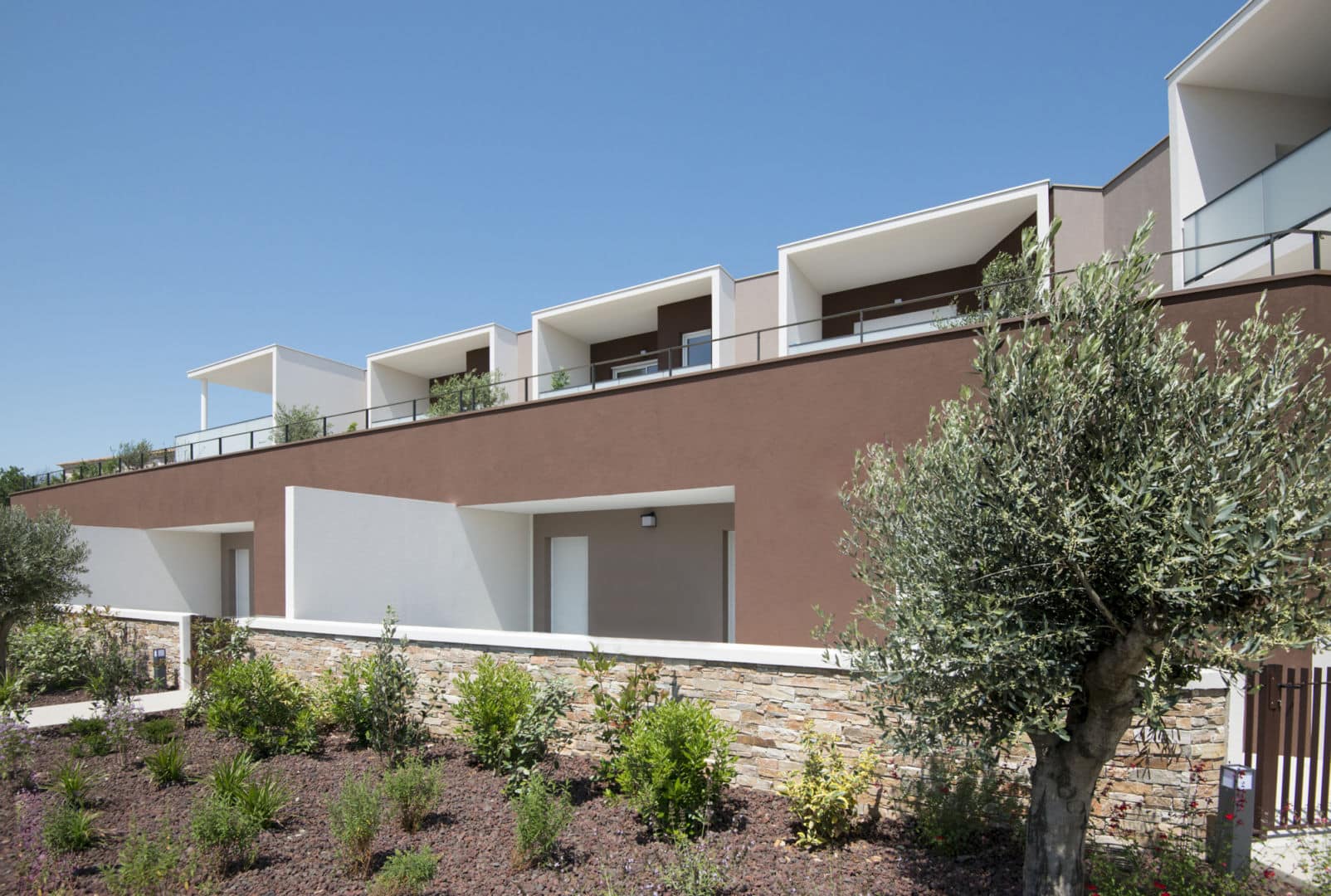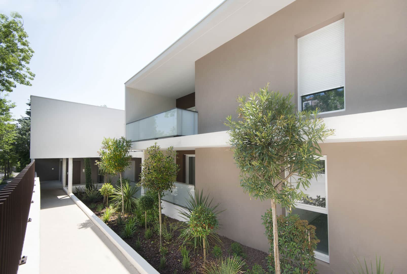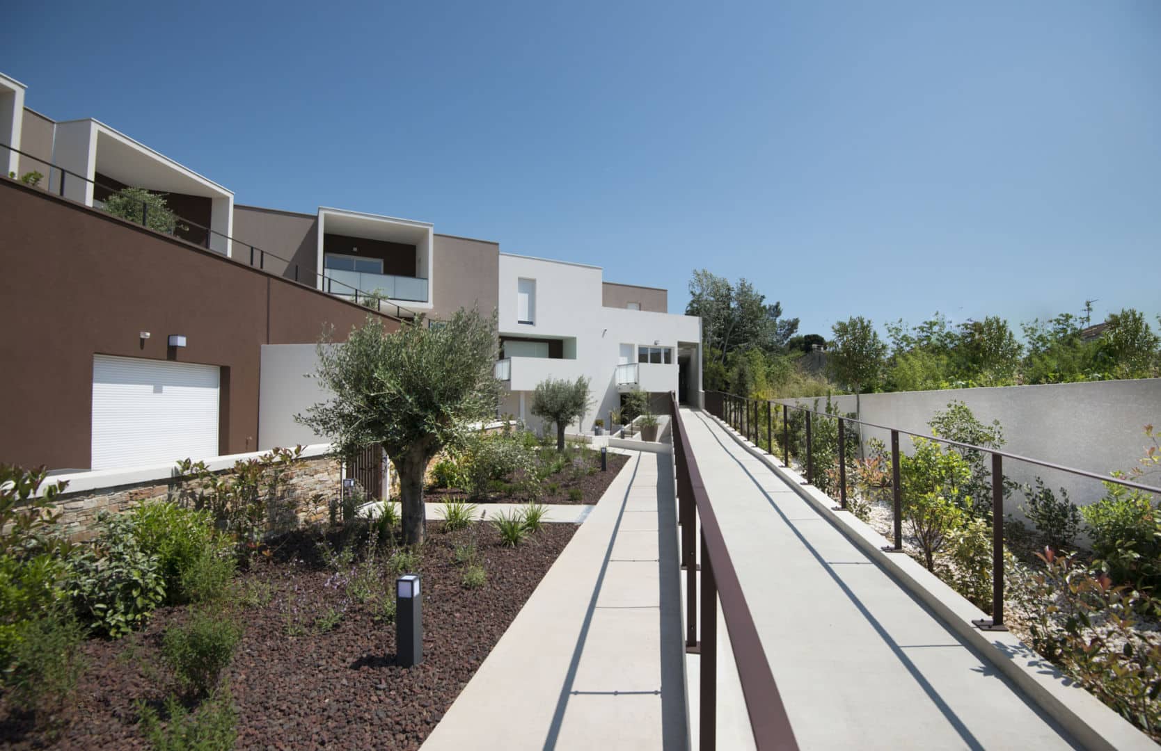De faible hauteur, la résidence est tournée en direction du sud, vers lequel de nombreuses terrasses s’ouvrent sur un jardin paysager qui apporte cale et bien-être aux résidents.